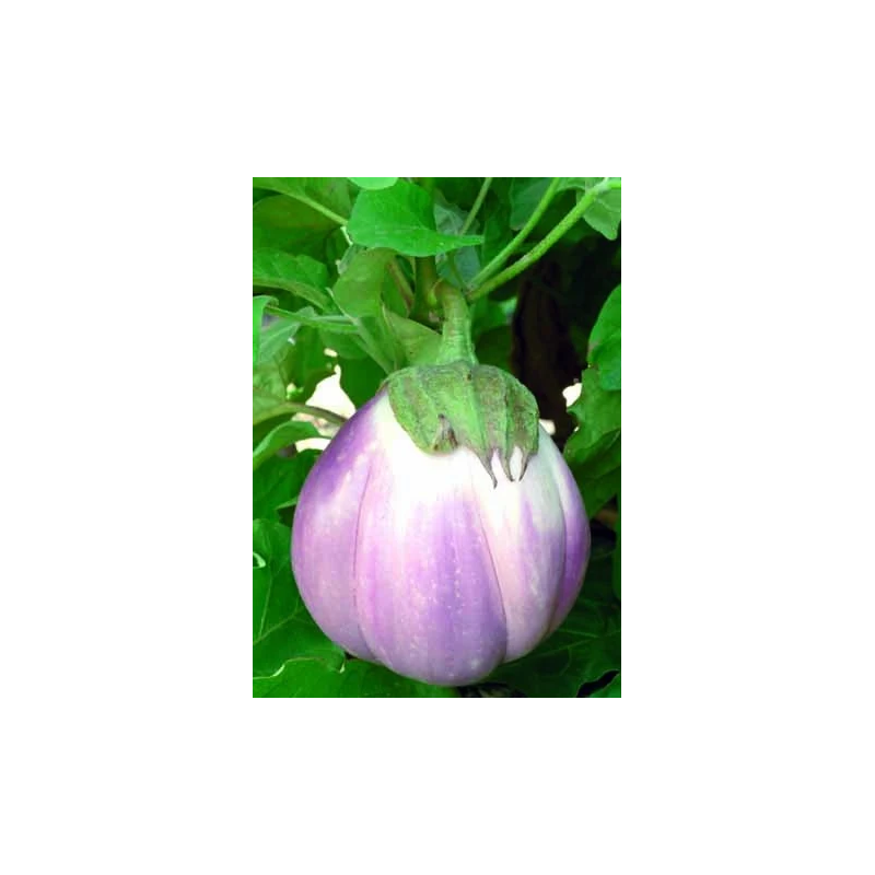 Aubergine ronde blanche striée de rose. Variété ancienne rustique et très productive. Originaire d'Italie, produit des fruits ronds attractifs, blancs teinté de rose. Chair à la saveur douce, onctueuse sans amertume.