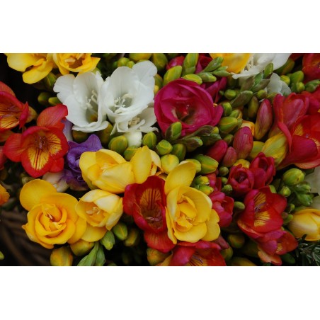 Les freesias sentent délicieusement bon et sont parfaits en fleurs coupées. Leur floraison est plus abondante si les fleurs fanées sont régulièrement retirées. Plantez-les dans un sol bien drainé, pointes vers le haut, à 5/7cm de profondeur et 10cm de distance. Conservez-les dans un endroit frais et sec jusqu'à la plantation. Les freesias peuvent être plantés de mars à mai selon les régions, on peut également les planter à l'automne dans un pot mais en situation de hors gel, pour fleurir en plein hiver.
