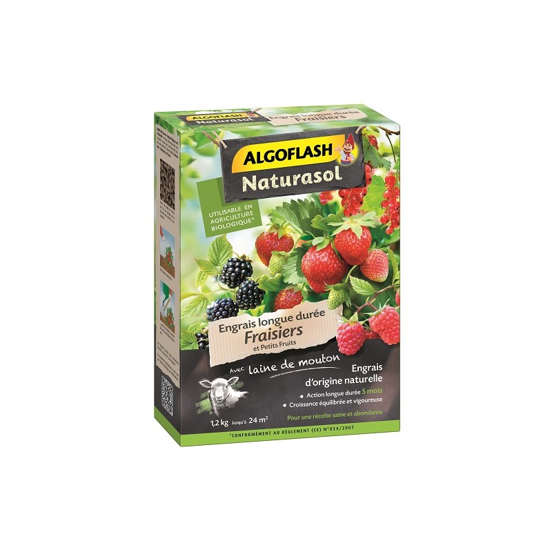 Il favorise la croissance des fraisiers et arbustes à petits fruits, récoltes abondantes et de qualité. Composé de laine de mouton, celle -ci est riche en éléments nutritifs. Action longue durée de 5 mois, il s'utilise de mars à octobre sur fraisiers, groseilliers, cassissiers, mûriers, myrtilliers et framboisiers. Instructions très lisibles sur l'emballage.